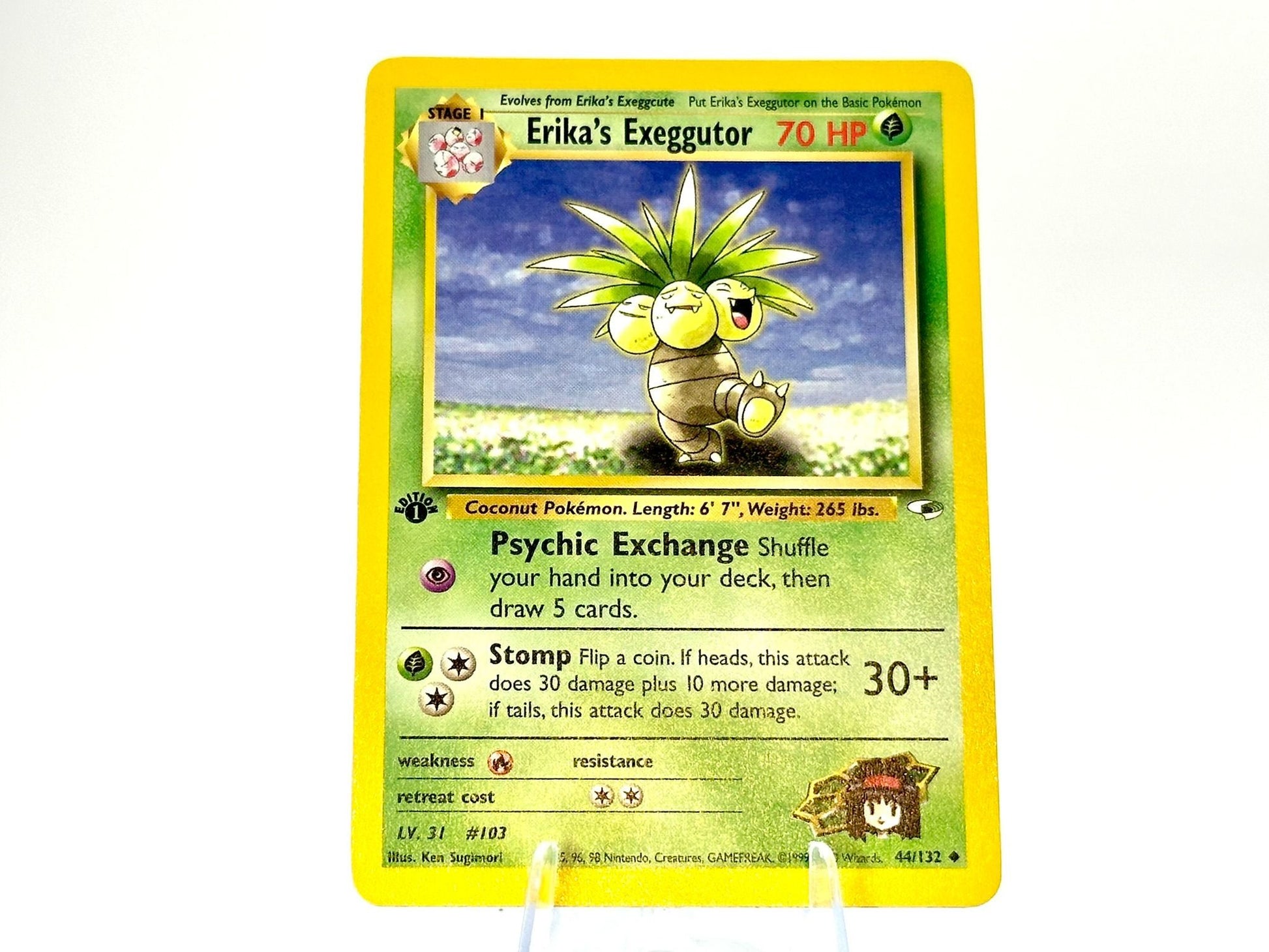 1st Edition from the Erika’s Exeggutor set. This card is from the Gym Heroes [44/132] era. Carefully protected during shipping. Authentic Pokémon card. Please check photos for condition.