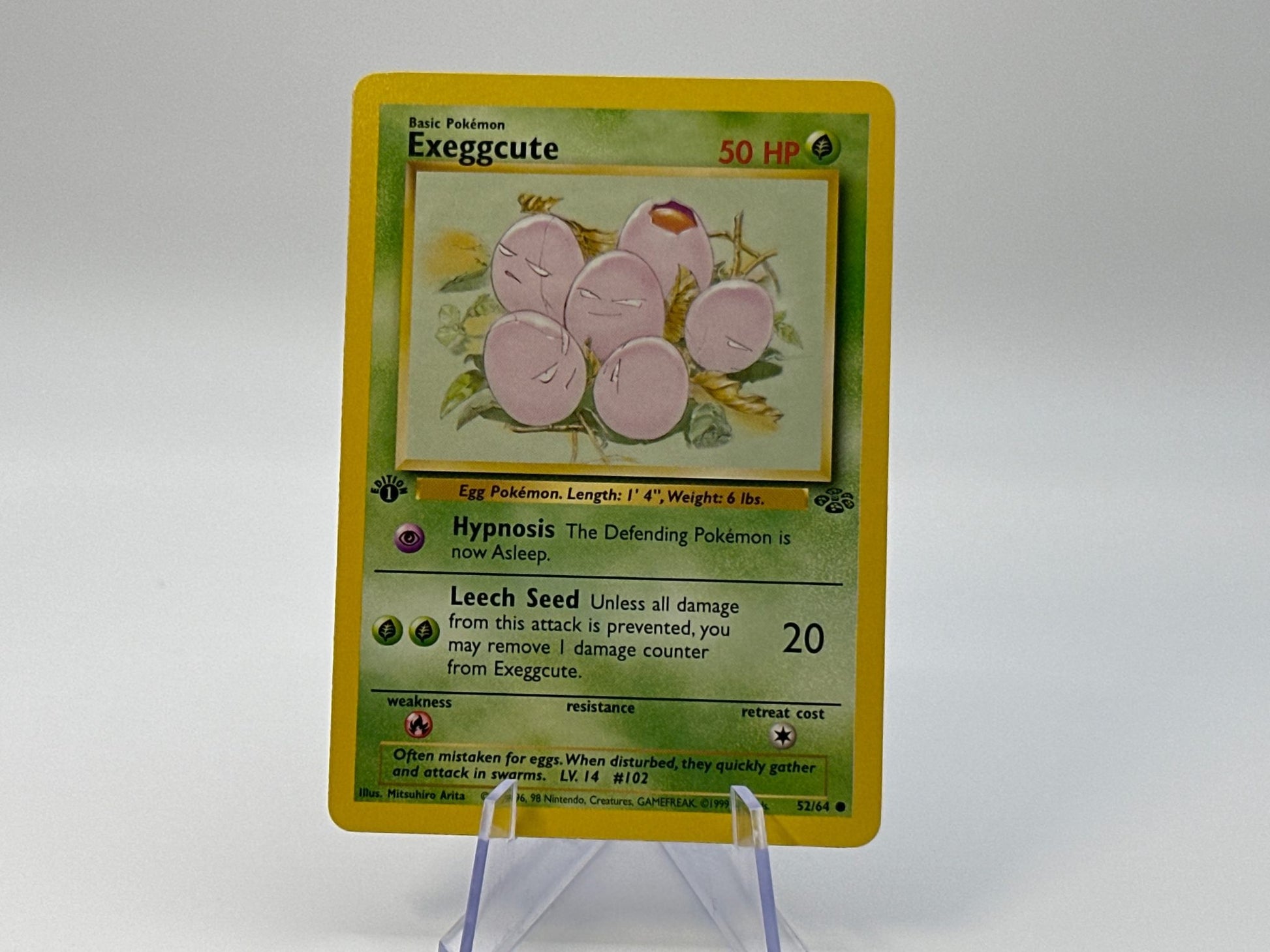 1st Edition from the Exeggcute set. This card is from the Jungle [52/64] era. Carefully protected during shipping. Authentic Pokémon card. Please check photos for condition.