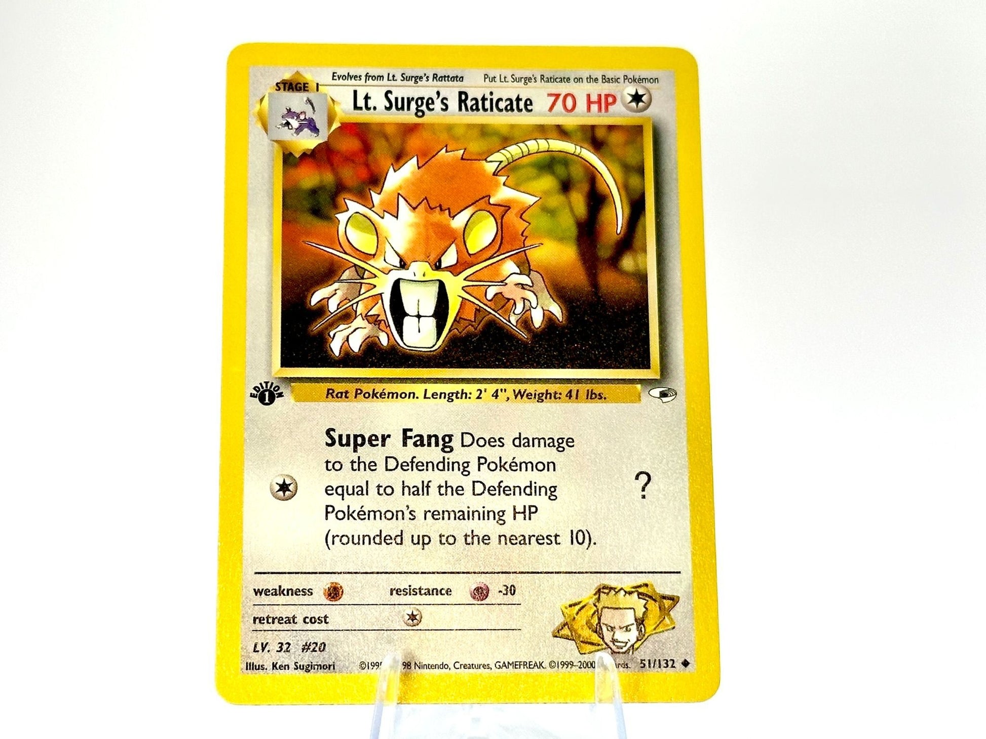 1st Edition from the Lt. Surge’s Raticate set. This card is from the Gym Heroes [51/132] era. Carefully protected during shipping. Authentic Pokémon card. Please check photos for condition.
