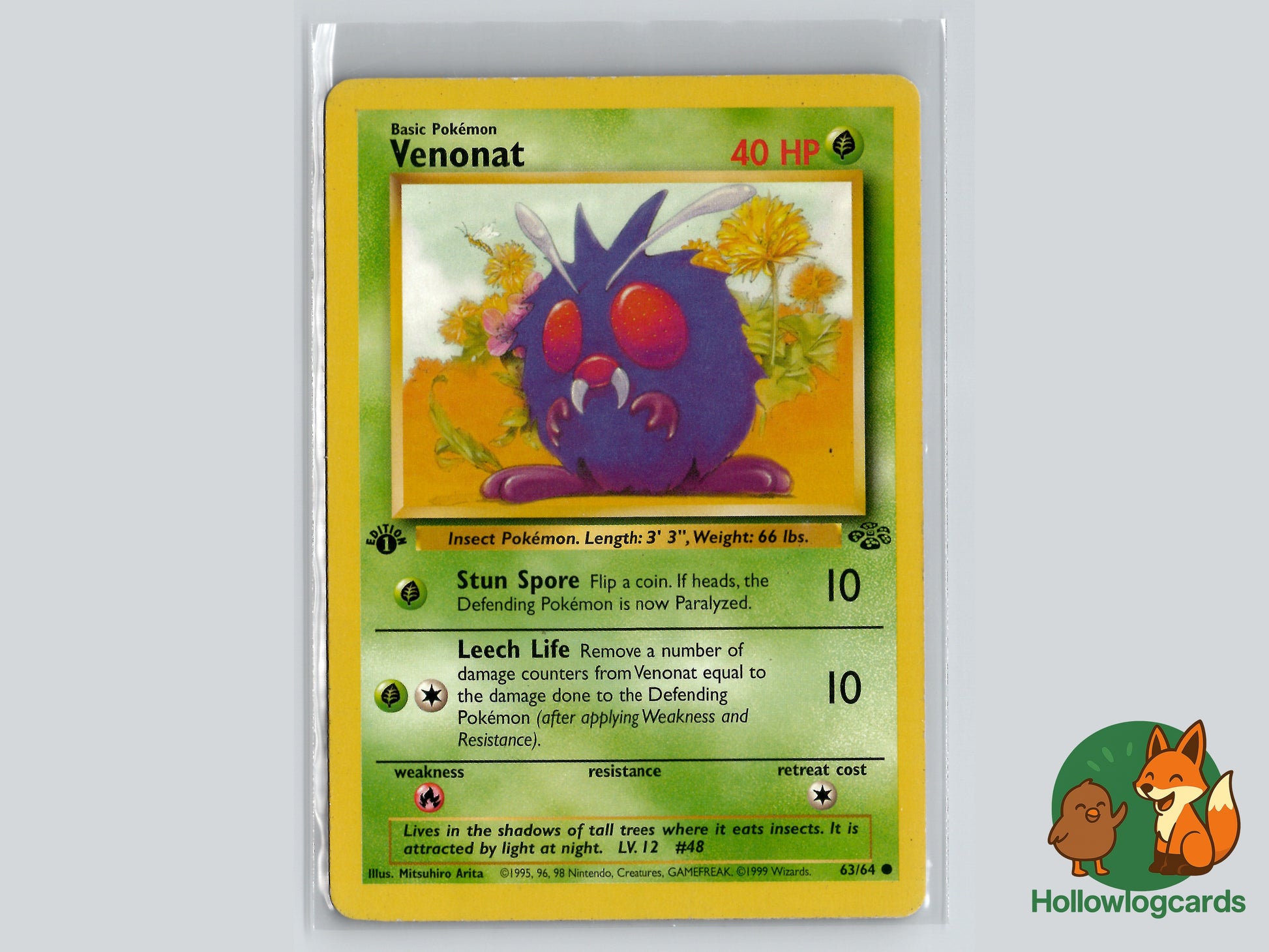 1st Edition from the Venonat set. Carefully protected during shipping. Authentic Pokémon card. Please check photos for condition.