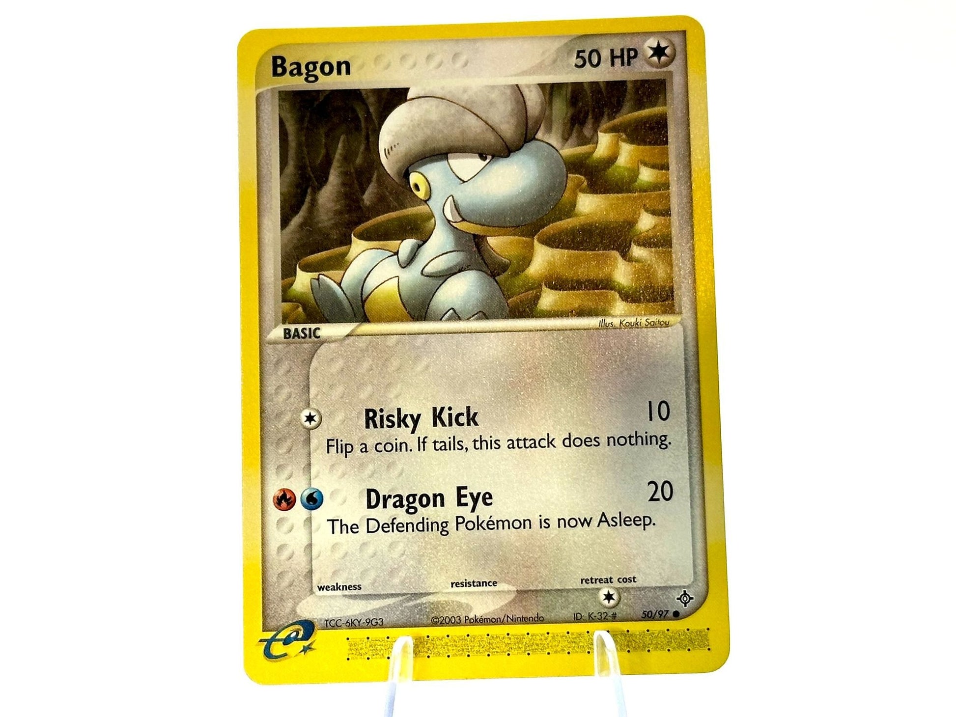 Bagon from the EX Dragon [50/97] set. This card is from the 2003 MidEra era. Carefully protected during shipping. Authentic Pokémon card. Please check photos for condition.