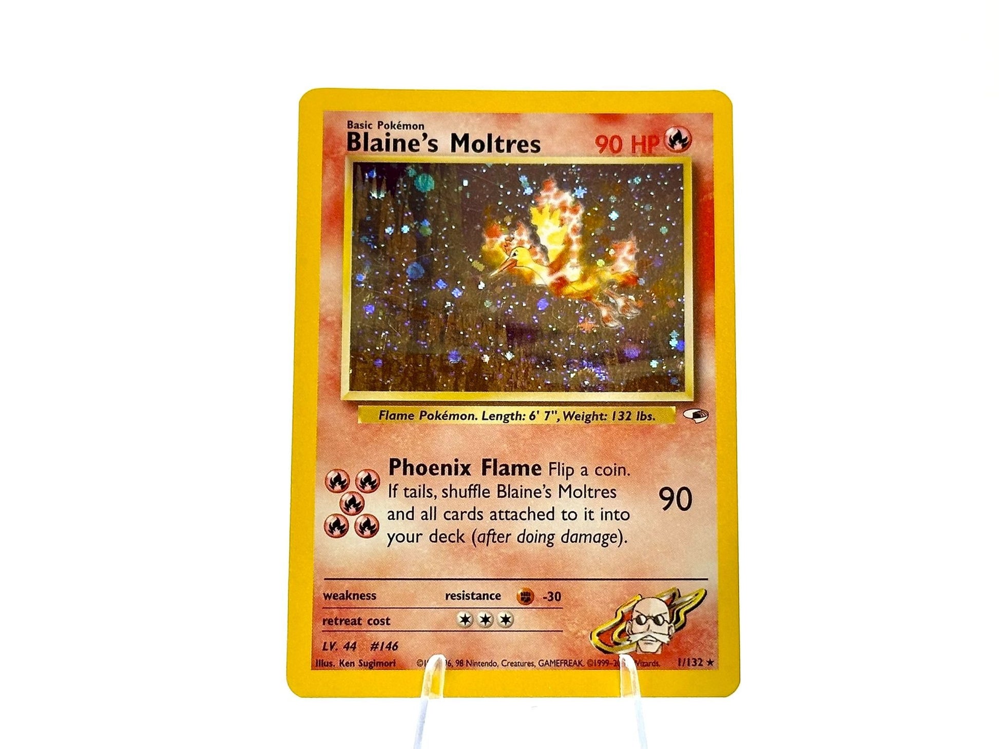 Blaine’s Moltres from the Gym Challenge 1/132 set. This card is from the WOTC era. Carefully protected during shipping. Authentic Pokémon card. Please check photos for condition.