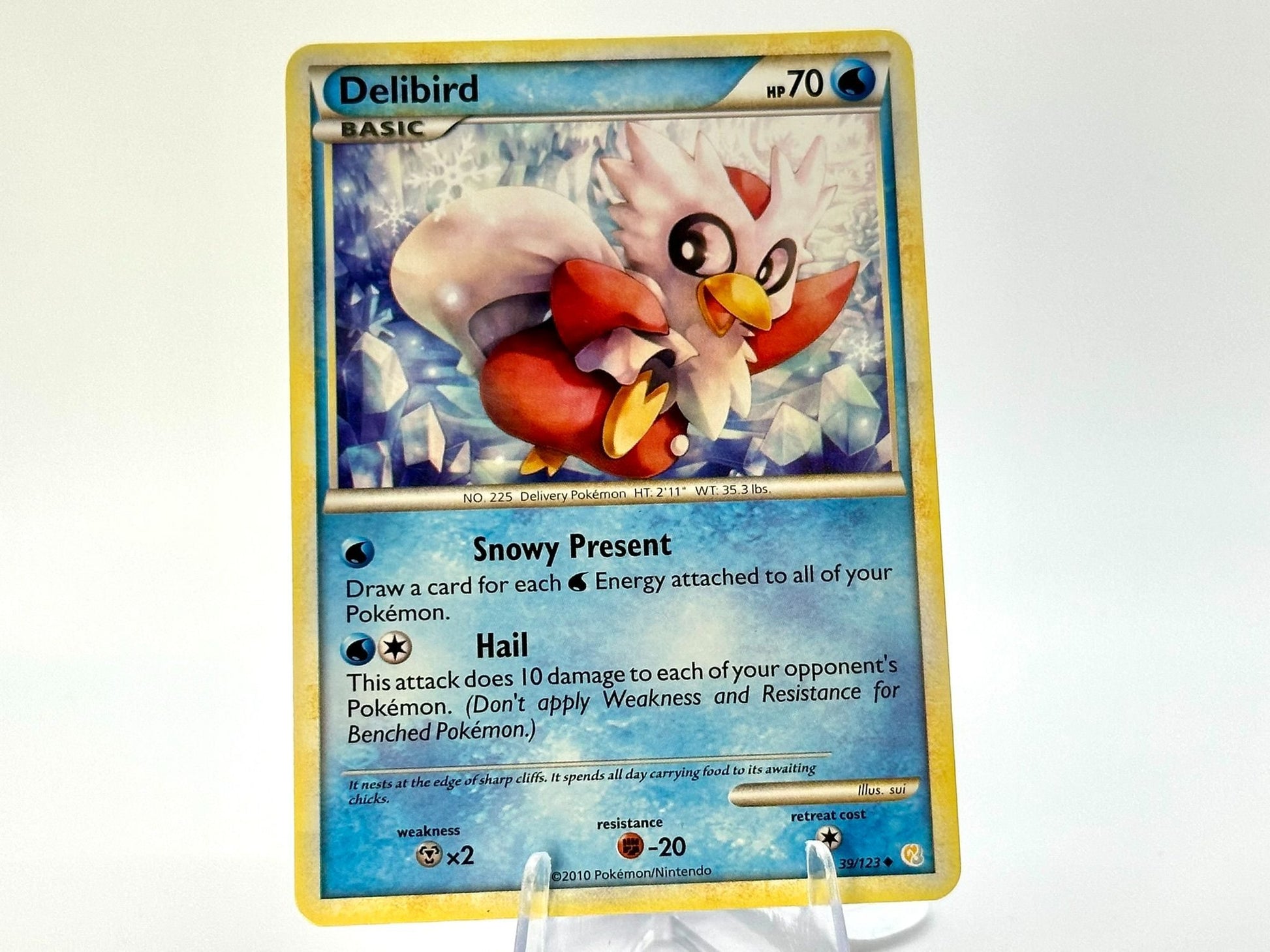 Delibird from the HeartGold & SoulSilver [39/123] set. This card is from the 2010 MidEra era. Carefully protected during shipping. Authentic Pokémon card. Please check photos for condition.