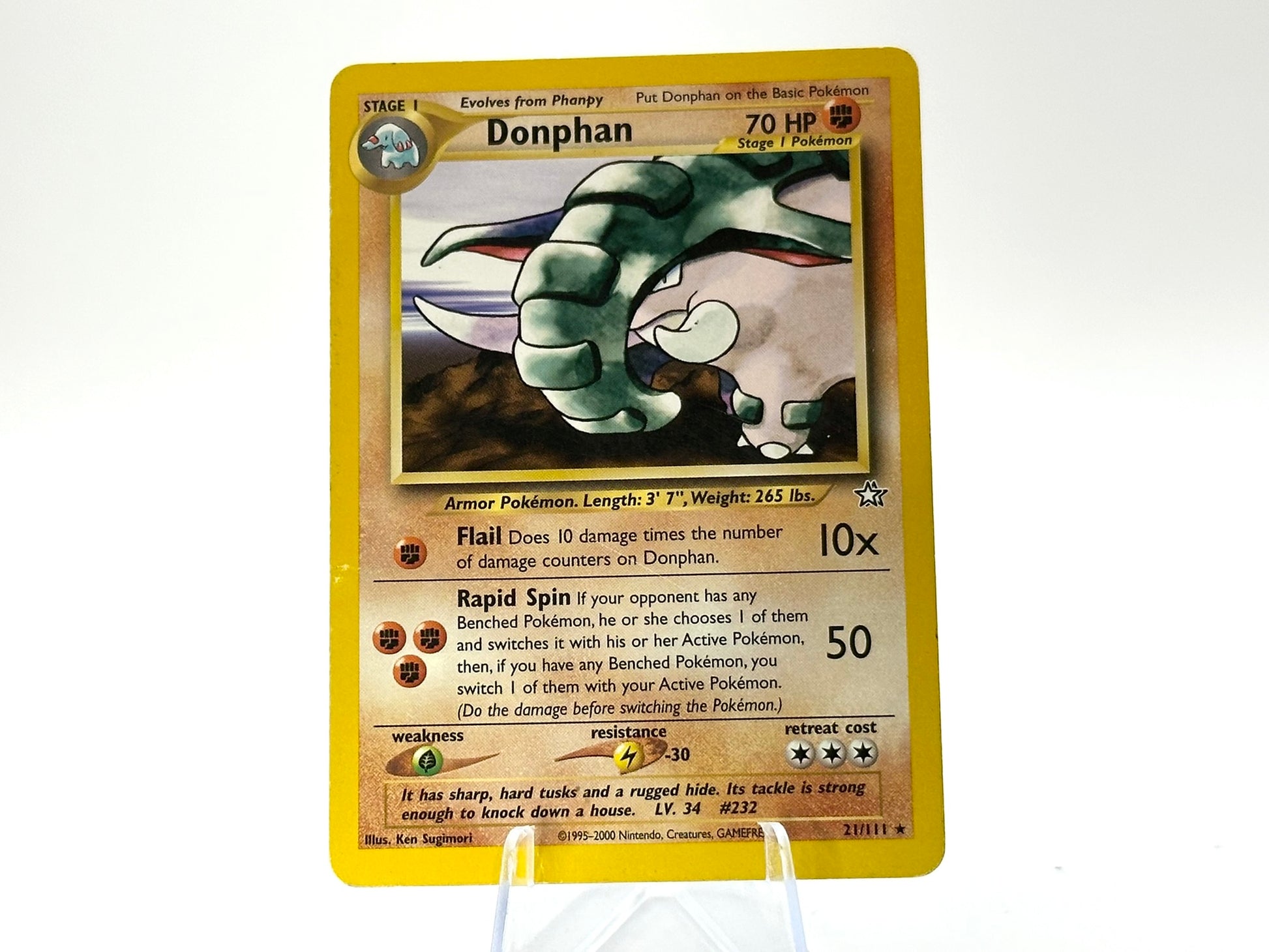 Donpha from the Neo Genesis set. This card is from the Rare era. Carefully protected during shipping. Authentic Pokémon card. Please check photos for condition.