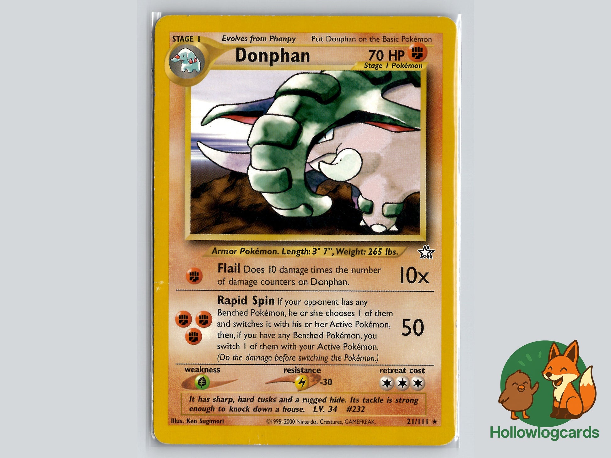 Donphan from the Neo Genesis set. This card is from the Rare era. Carefully protected during shipping. Authentic Pokemon card. Please check photos for condition.