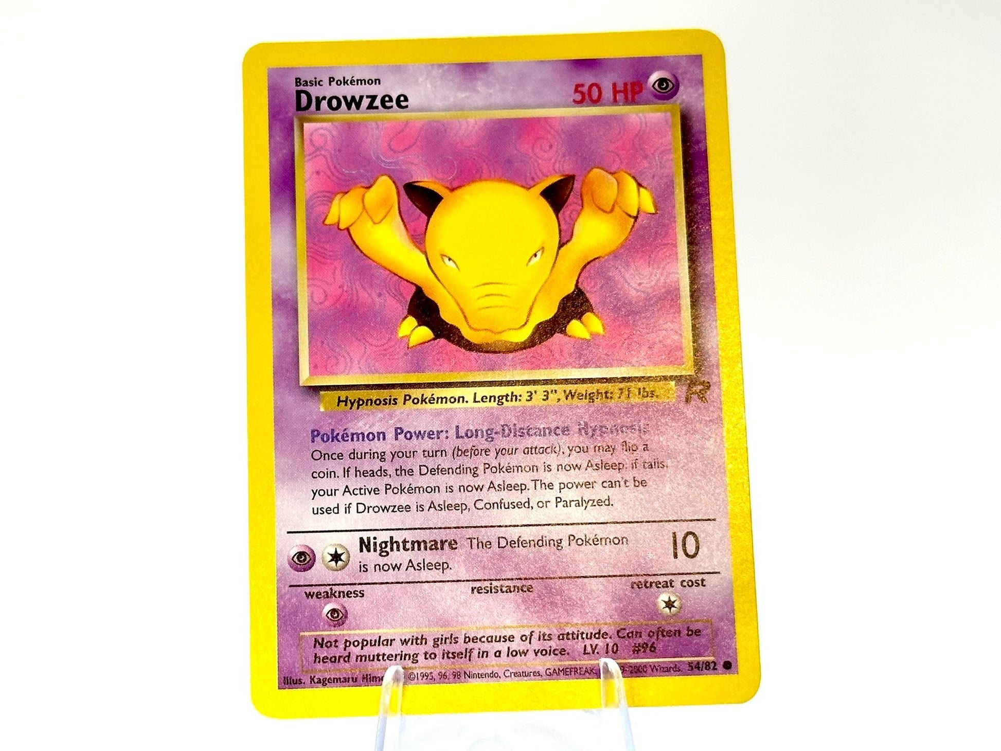 Drowzee from the Team Rocket [56/82] set. This card is from the 2000 WOTC era. Carefully protected during shipping. Authentic Pokémon card. Please check photos for condition.