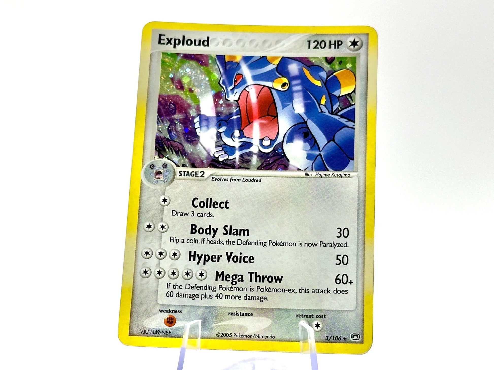 Exploud from the HOLO EX Emerald [3/106] set. This card is from the 2005 MidEra era. Carefully protected during shipping. Authentic Pokémon card. Please check photos for condition.