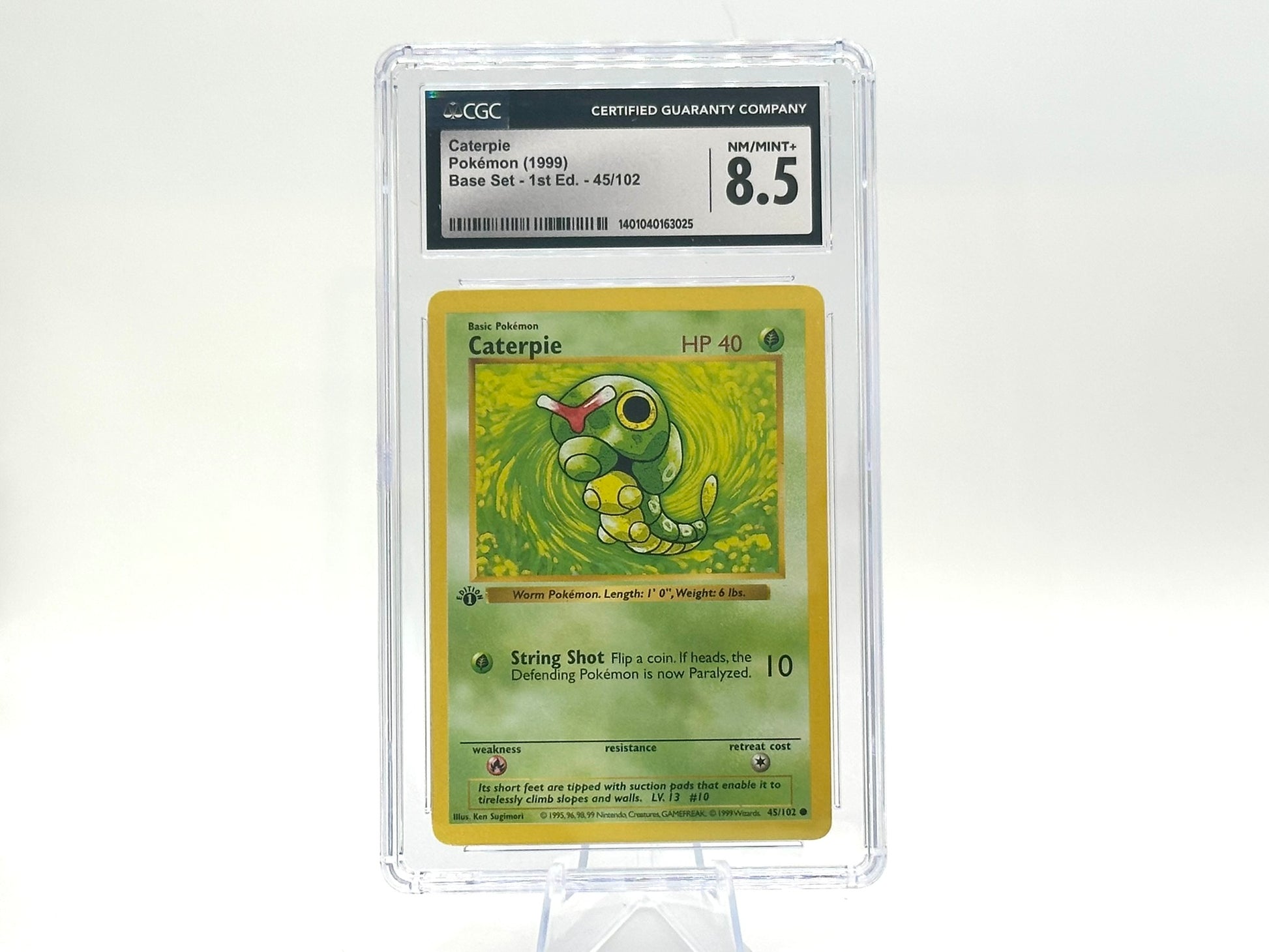 This CGC graded 8.5 Caterpie is from the iconic Base Set (WOTC, 1999), featuring card number 45/102. It's a 1st Edition card illustrated by - Sugimori and officially released by Wizards of the Coast. A must-have for vintage Pokémon collectors and fans of the original 1999 base era!