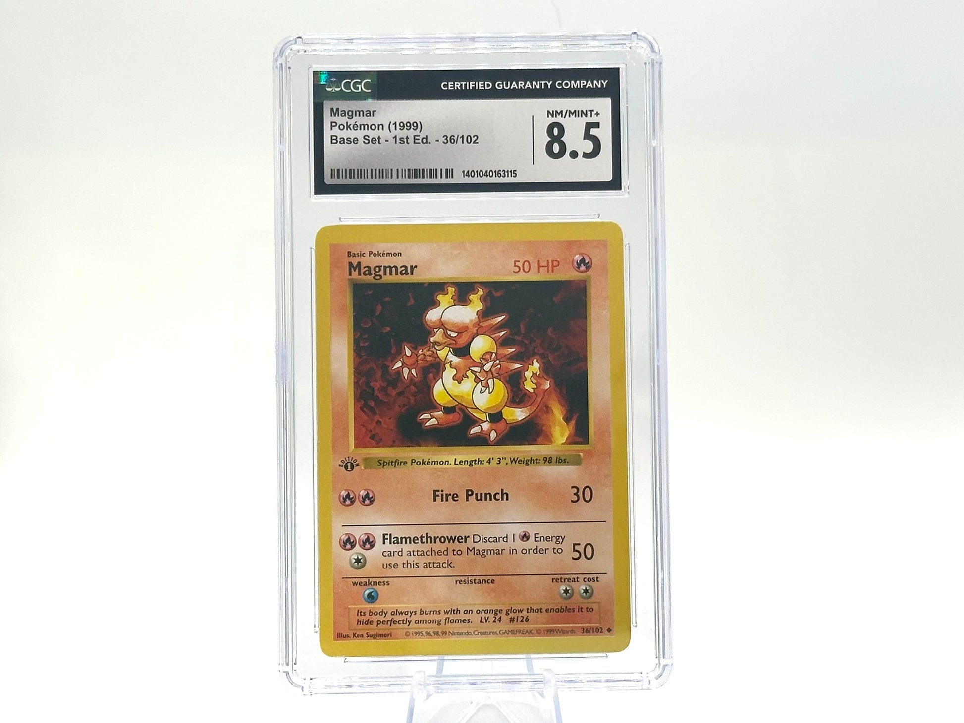 This CGC graded 8.5 Magmar is from the iconic Base Set (WOTC, 1999), featuring card number 36/102. It's a 1st Edition card illustrated by - Sugimori and officially released by Wizards of the Coast. A must-have for vintage Pokémon collectors and fans of the original 1999 base era!