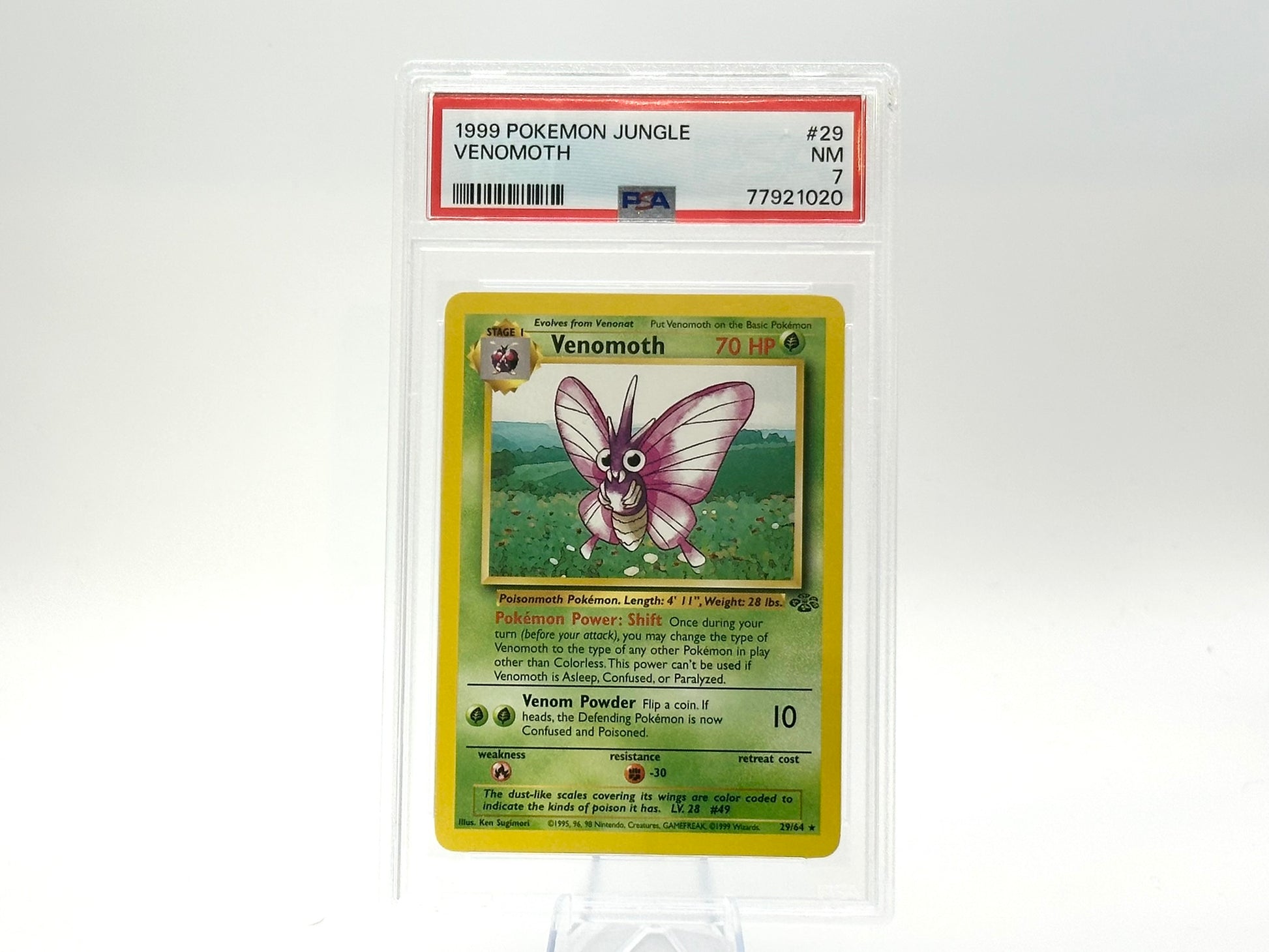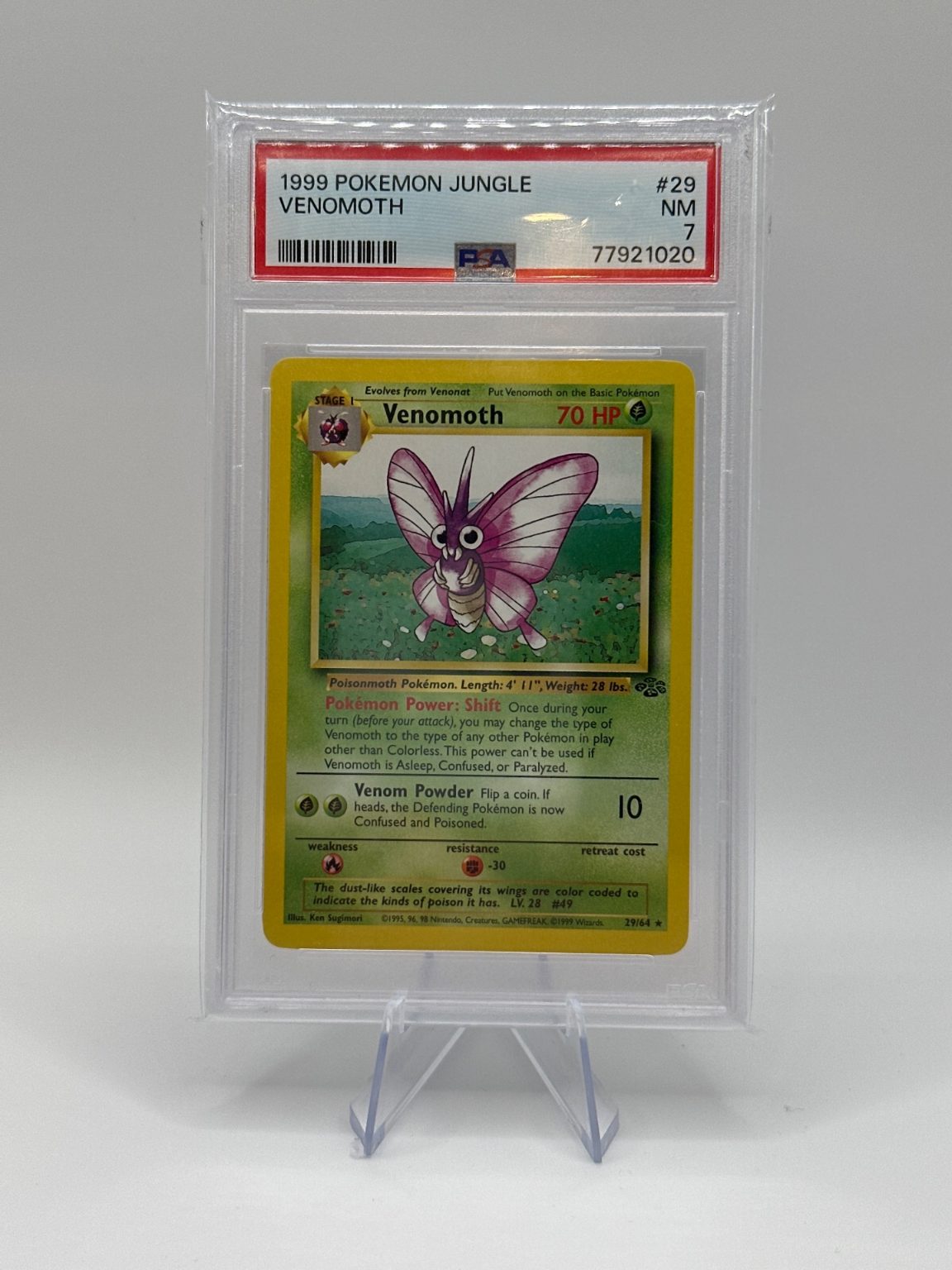 Graded Venomoth from the JUNGLE PSA 7 set. Carefully protected during shipping. Authentic Pokémon card. Please check photos for condition.
