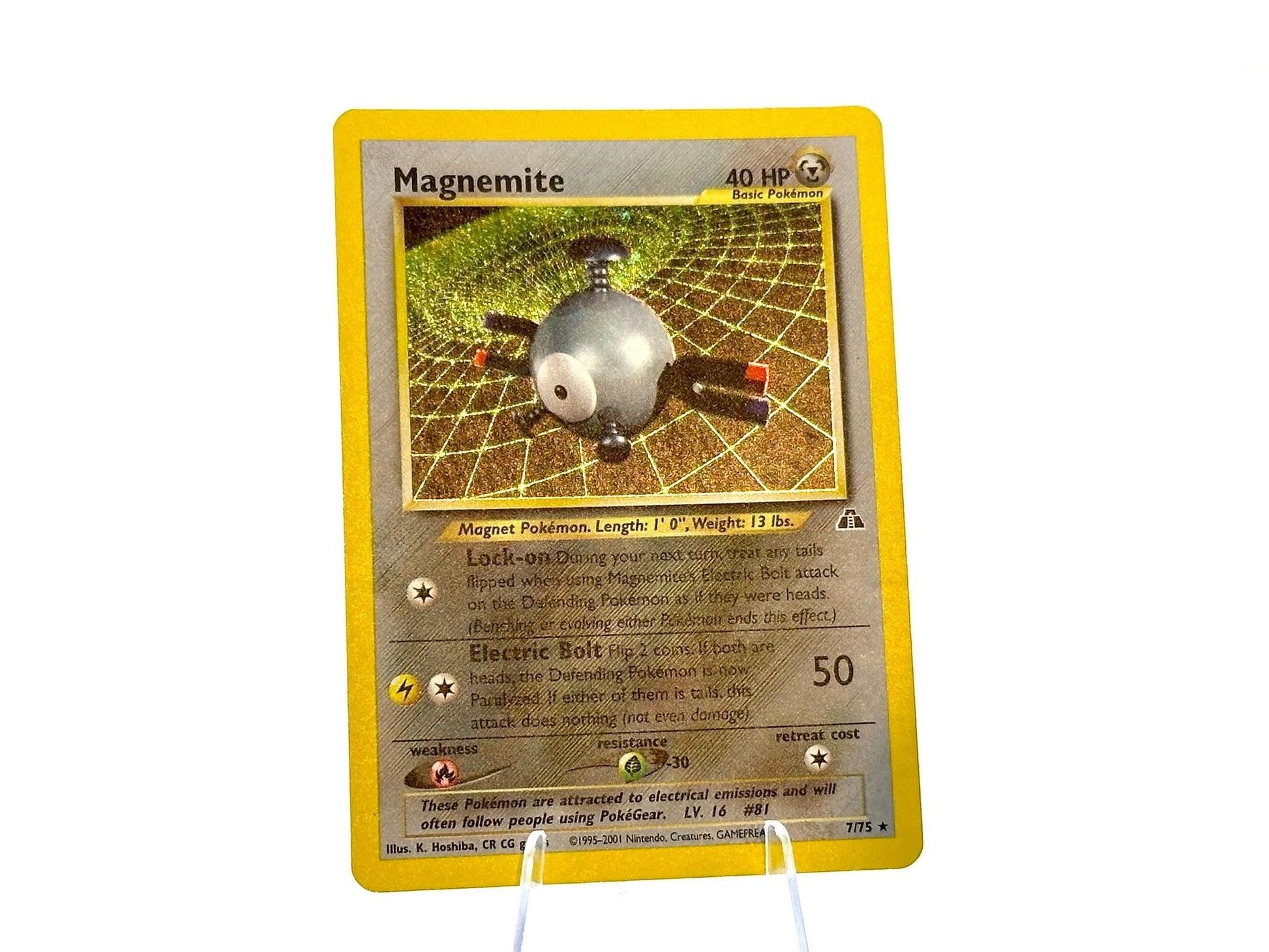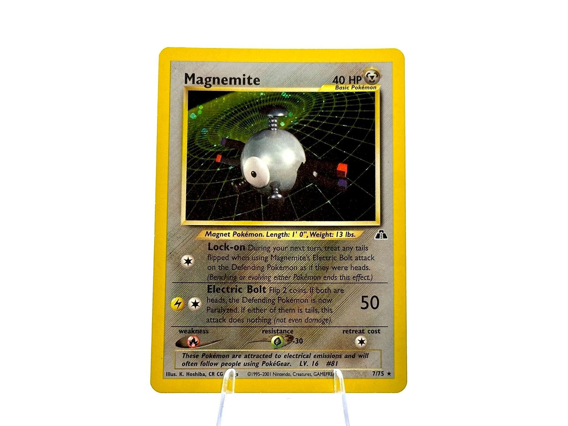 Magnemite from the HOLO Neo Discovery 7/75 set. This card is from the WOTC era. Carefully protected during shipping. Authentic Pokémon card. Please check photos for condition.