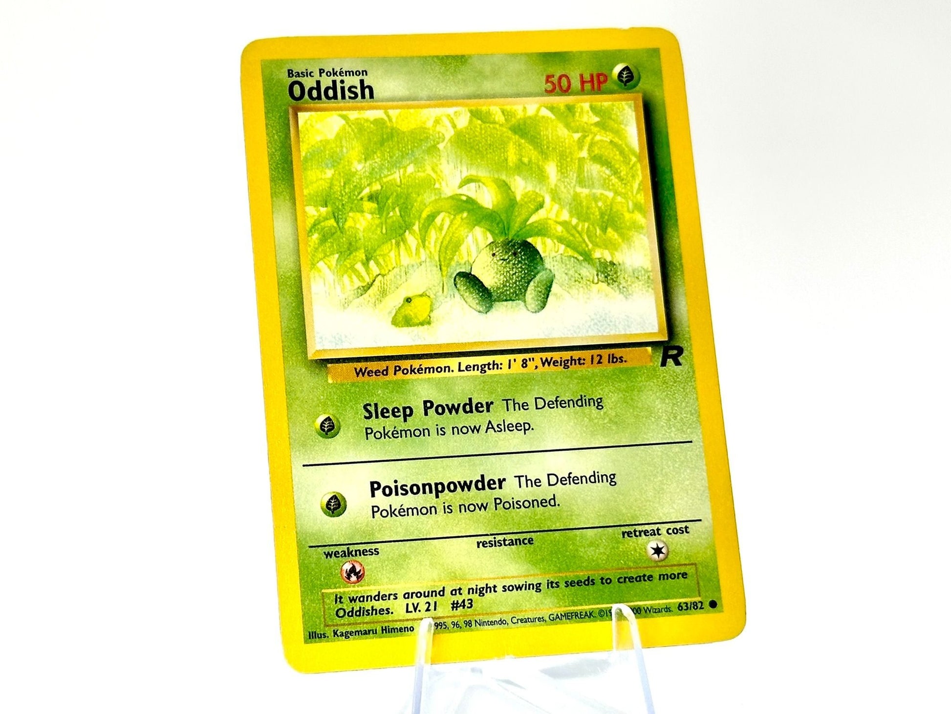 Oddish from the Team Rocket [63/82] set. This card is from the 2000 WOTC era. Carefully protected during shipping. Authentic Pokémon card. Please check photos for condition.