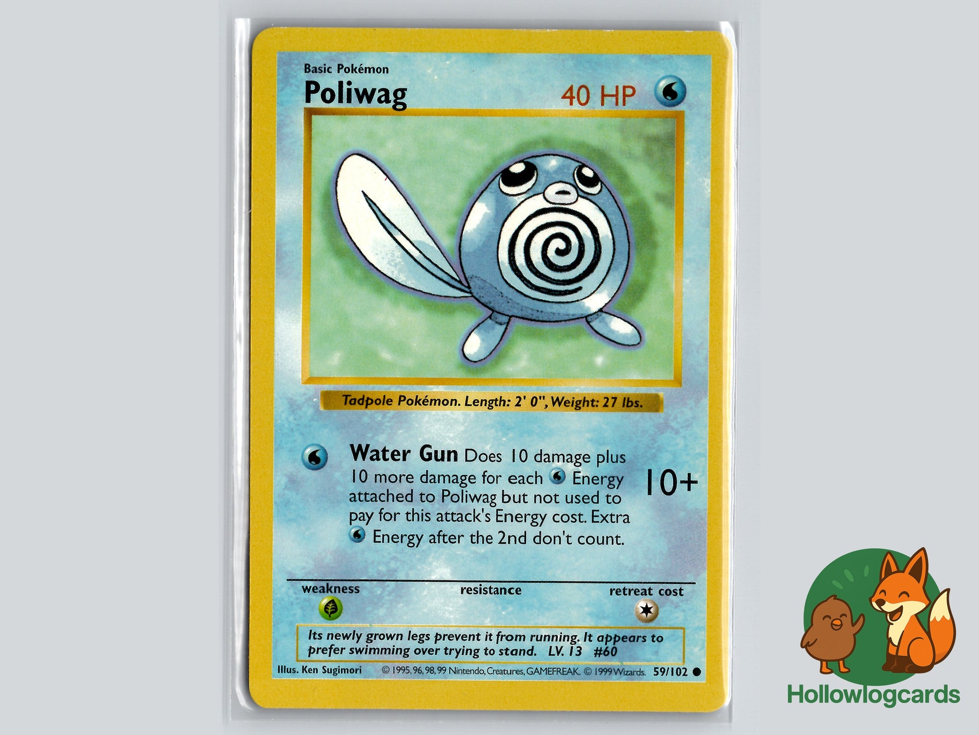 Poliwag from the Shadowless set. Carefully protected during shipping. Authentic Pokemon card. Please check photos for condition.