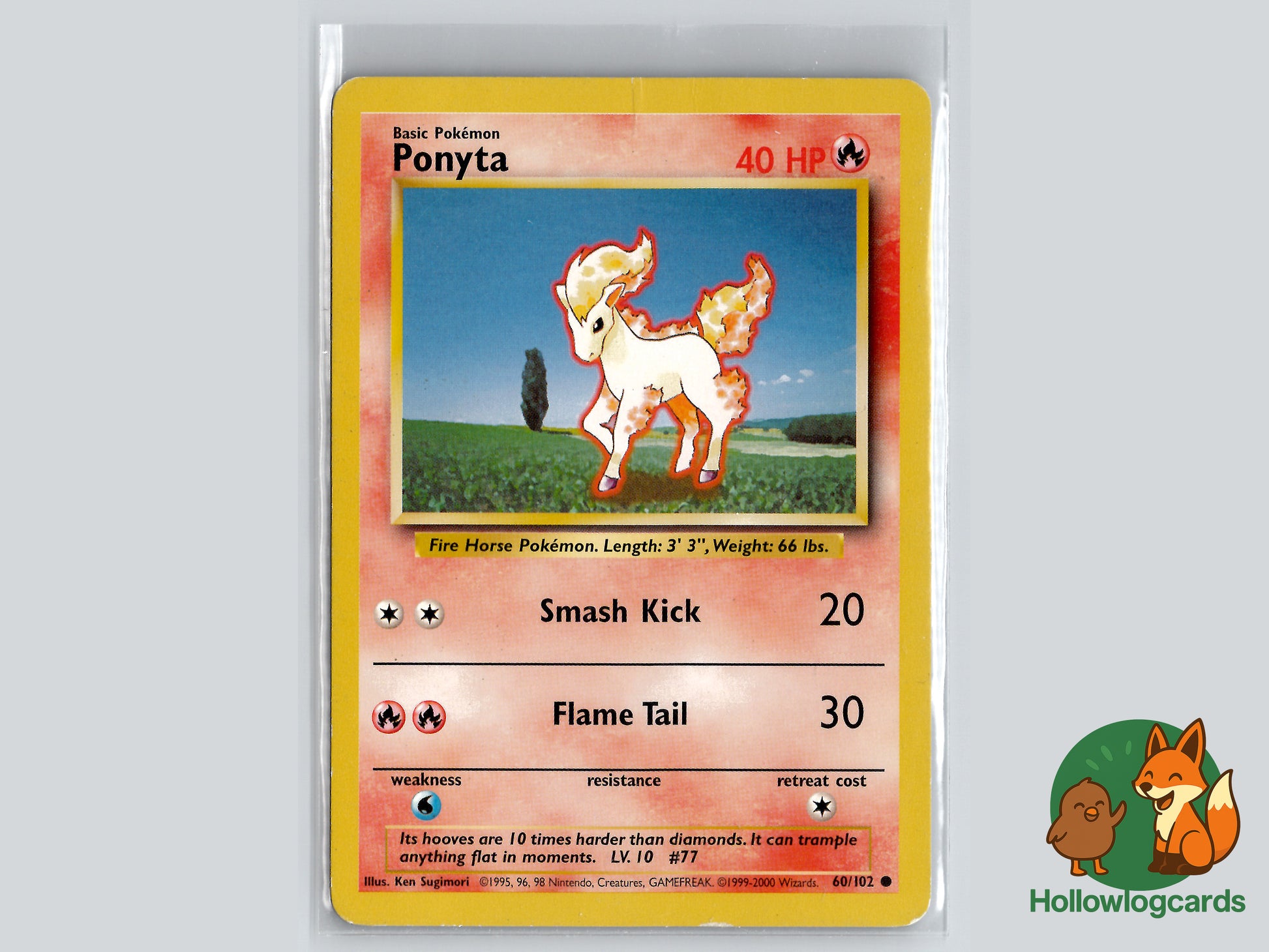 Ponyta from the 4th Print Base Set 1999 set. Carefully protected during shipping. Authentic Pokemon card. Please check photos for condition.