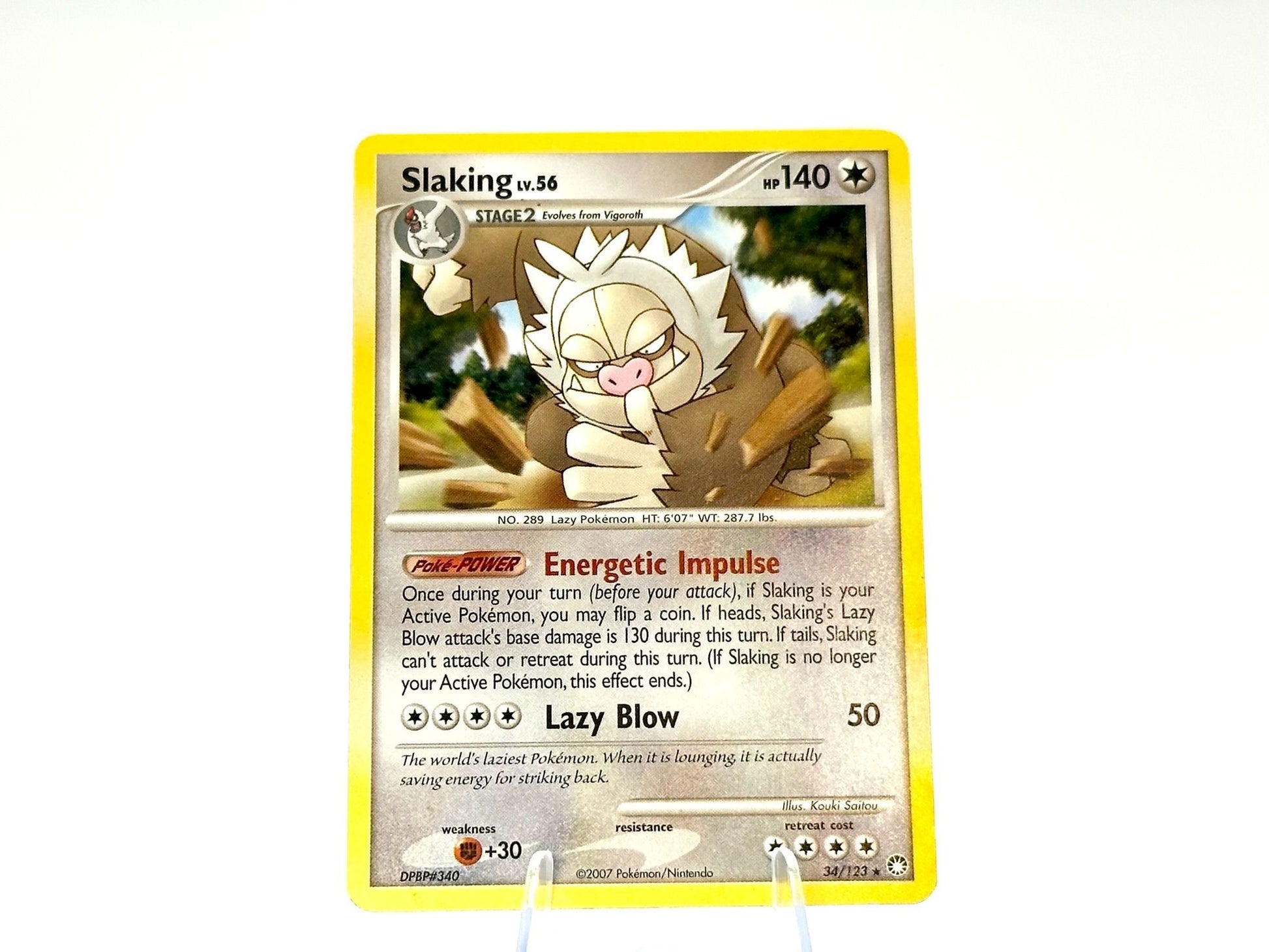 Slaking from the Diamond & Pearl [34/123] set. This card is from the 2007 MidEra era. Carefully protected during shipping. Authentic Pokémon card. Please check photos for condition.