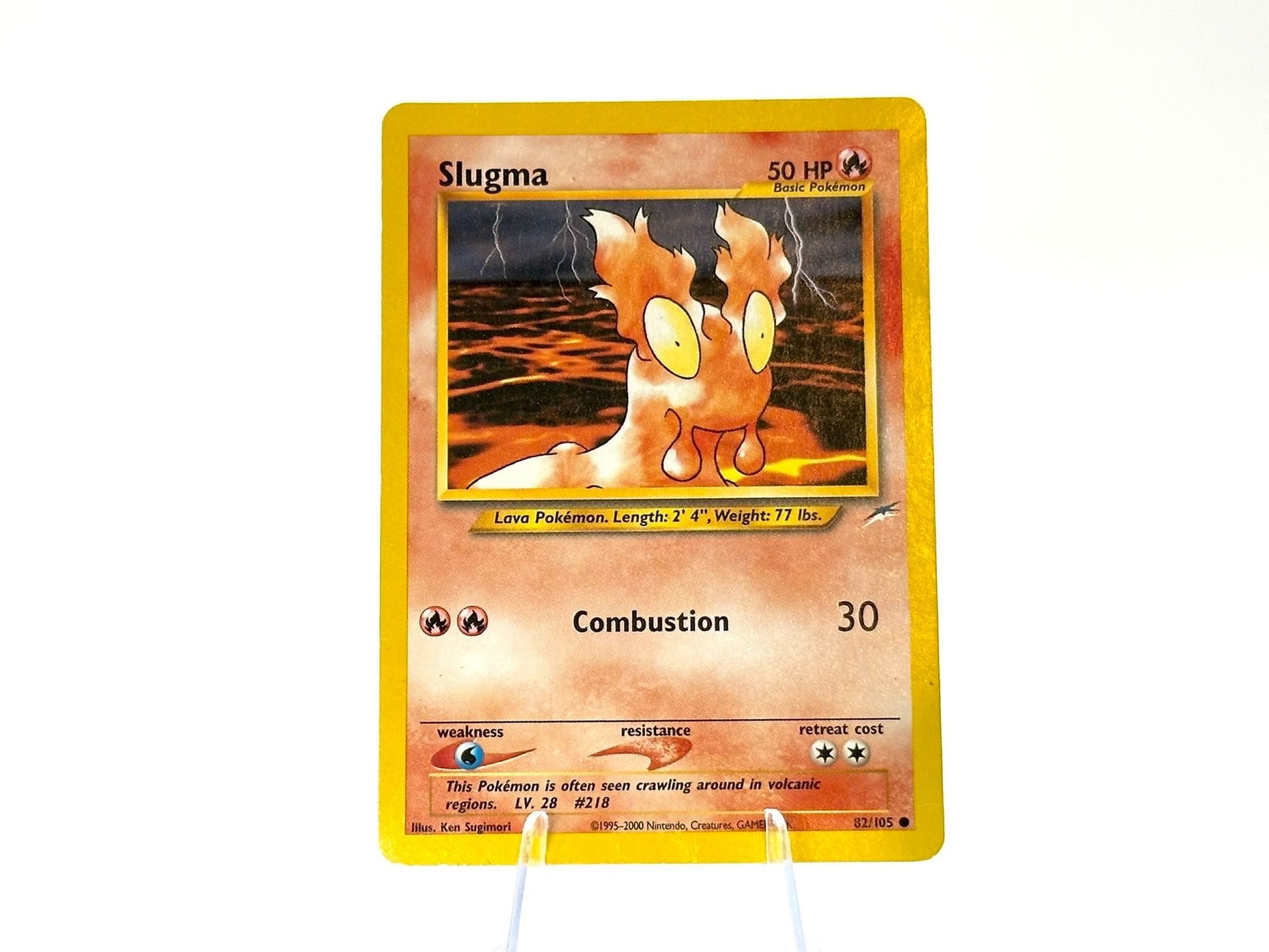 Slugma from the Neo Destiny [82/105] set. This card is from the 2000 WOTC era. Carefully protected during shipping. Authentic Pokémon card. Please check photos for condition.