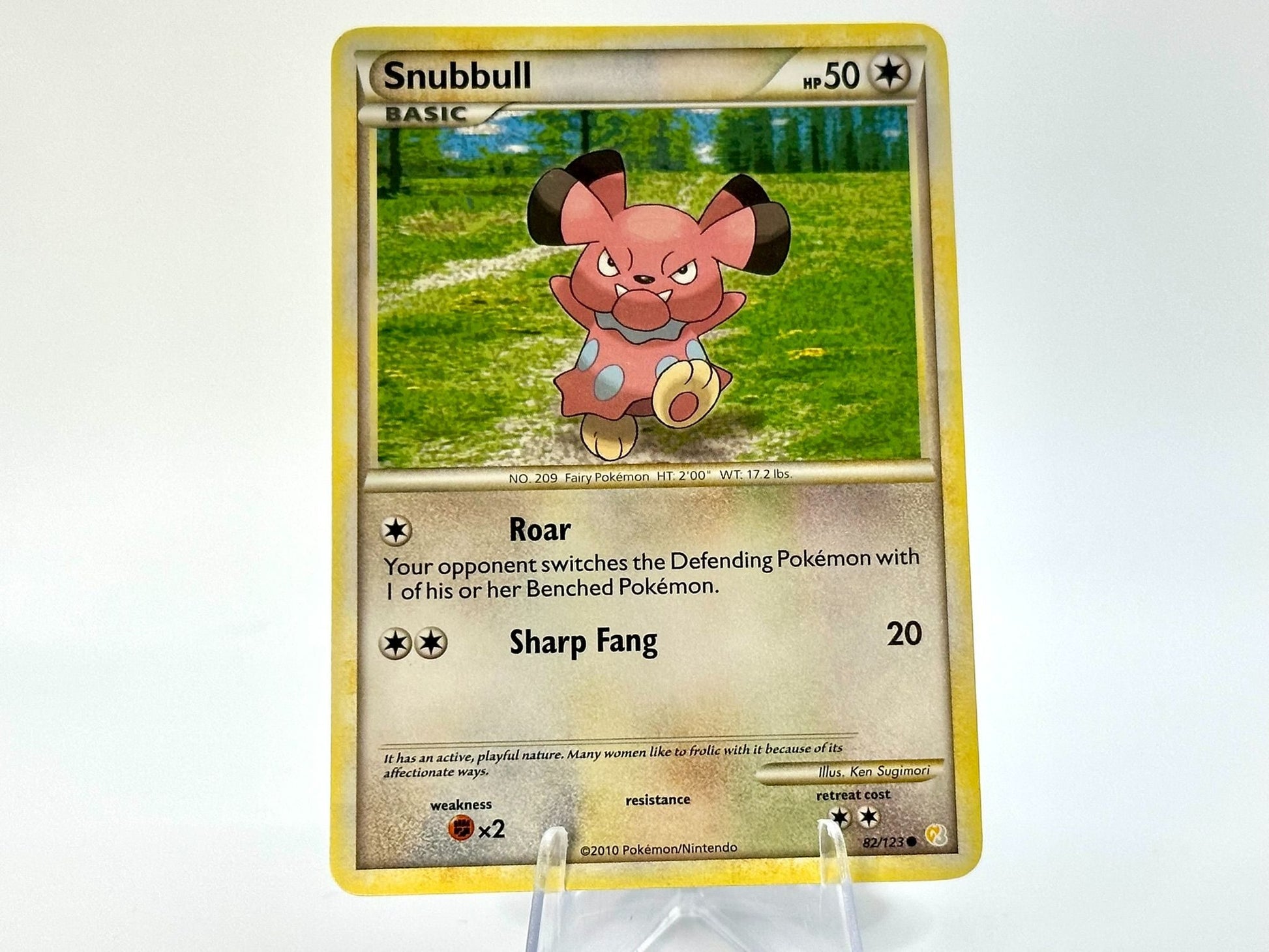 Snubbull from the HeartGold & SoulSilver [82/123] set. This card is from the 2010 MidEra era. Carefully protected during shipping. Authentic Pokémon card. Please check photos for condition.